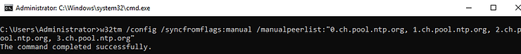 w32tm /config /syncfromflags:manual /manualpeerlist:”0.ch.pool.ntp.org, 1.ch.pool.ntp.org, 2.ch.pool.ntp.org, 3.ch.pool.ntp.org“