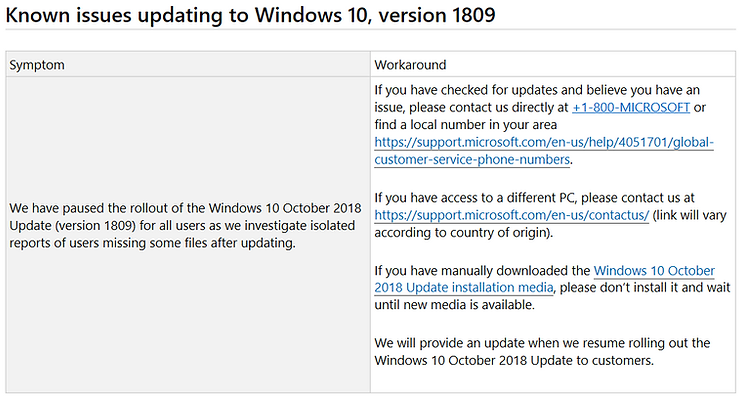 But I think, it is a bigger problem, because Microsoft has now stopped/paused the rollout of the Windows 10 October 2018 Update (Version 1809), as you can see on the Windows update history website (https://support.microsoft.com/en-us/help/4464619/windows-10-update-history).