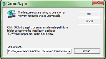 After you have extracted the msi files, you can then use Browse on the popup and chose the ICAWebWrapper.msi file. Click OK on the popup to install the Online Plug-in.